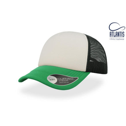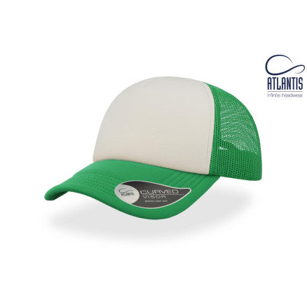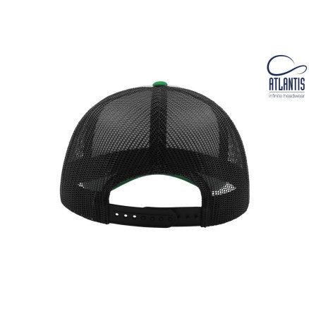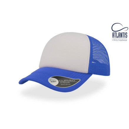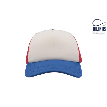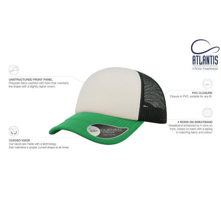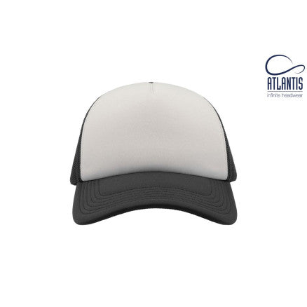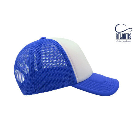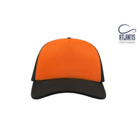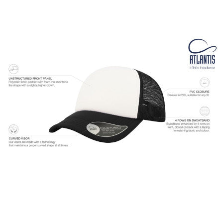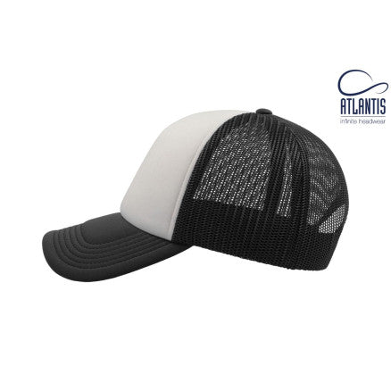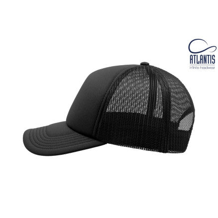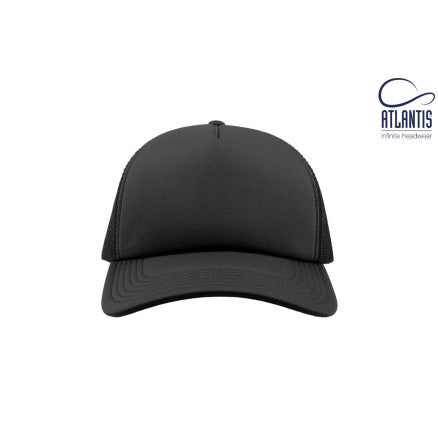 High crown trucker cap with polyester foam front panel as side and back panels in mesh material and a PVC closure.